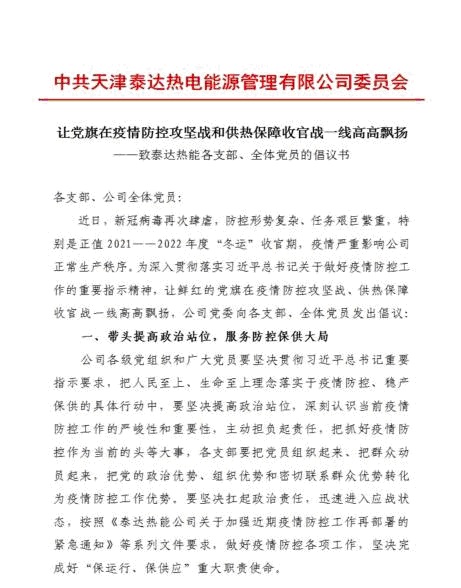 3月21日,疫情加剧,随着天津确诊人数不断增多,天津疫情防控措施不断升级,多区禁止跨区流动。为保障公司员工的生命健康,保证公司正常运转,公司明确下达各一线厂实行封闭管理的指令,采取两班制运行,员工食宿都在厂内,确保经开区供热稳定。同日,泰达热能党委面向全体党员发出倡议书,号召全体党员全力保运行、保供应,党员带头提高政治站位,强化责任担当,发挥党员的先锋模范作用,服务在防控保供的第一线,争当“抗疫先锋”,争做“保供卫士”,形成保供应、保运行和抗击疫情的强大合力,让鲜红的党旗在疫情防控攻坚战、供热保障收官战一线高高飘扬。
