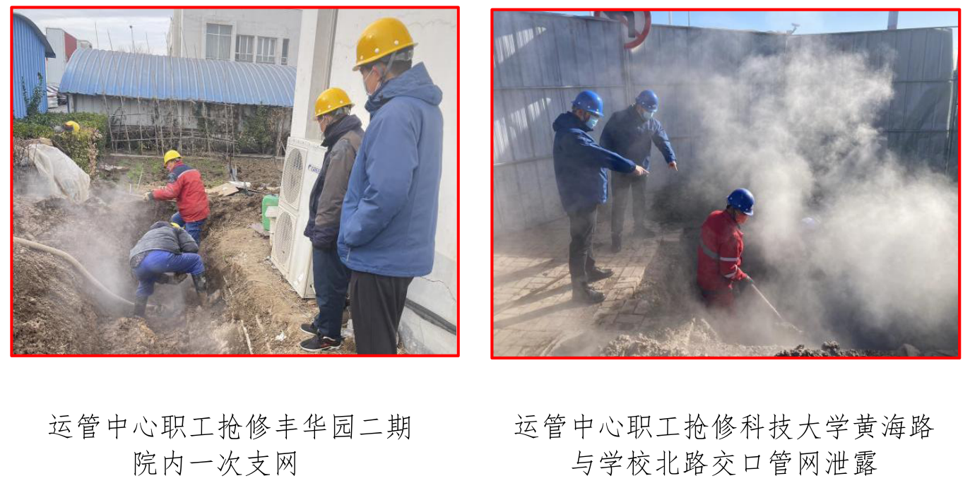 在供热负荷加大的情况下,公司抢修队伍24小时待命,随时应对突发状况,确保冬季供暖的连续性。同时,在滨城疫情多点爆发、道路不畅的背景下,泰达热能保持与有关部门沟通,在做好自身疫情防控的前提下,能够立即派抢修队伍达到现场,处理热源、管网等的突发情况,确保用户安心、安全用暖。11月29日,运管中心五厂站巡查发现丰华园二期院内DN150一次支网泄漏,漏点位于污水井内,运管中心第一时间联系抢修队伍进行抢修,仅仅用时8小时就完成抢修恢复供热。11月30日上午,运管中心大学城站巡网人员发现科技大学黄海路与学校北路交口有熥汽现象,这将影响科技大学学生公寓、教师公寓等面积15万平米的供暖,运管中心目前正全力组织人员进行抢修,力争以最快速度最高质量完成抢修。