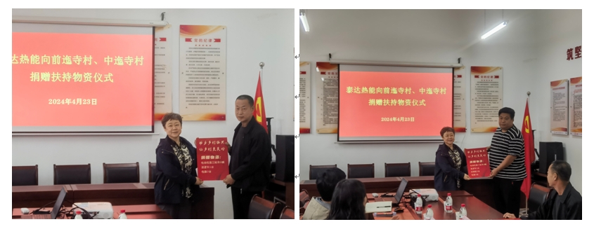 4月23日,泰达实业党委副书记石敬,泰达热能纪委书记刘芳一行来到武清区大良镇,为泰达热能对口扶持的经济薄弱村前迤寺村、中迤寺村捐赠物资,扶持村举行了捐赠仪式,大良镇党委副书记刘芳、人大副主席杨智等同志参加。
